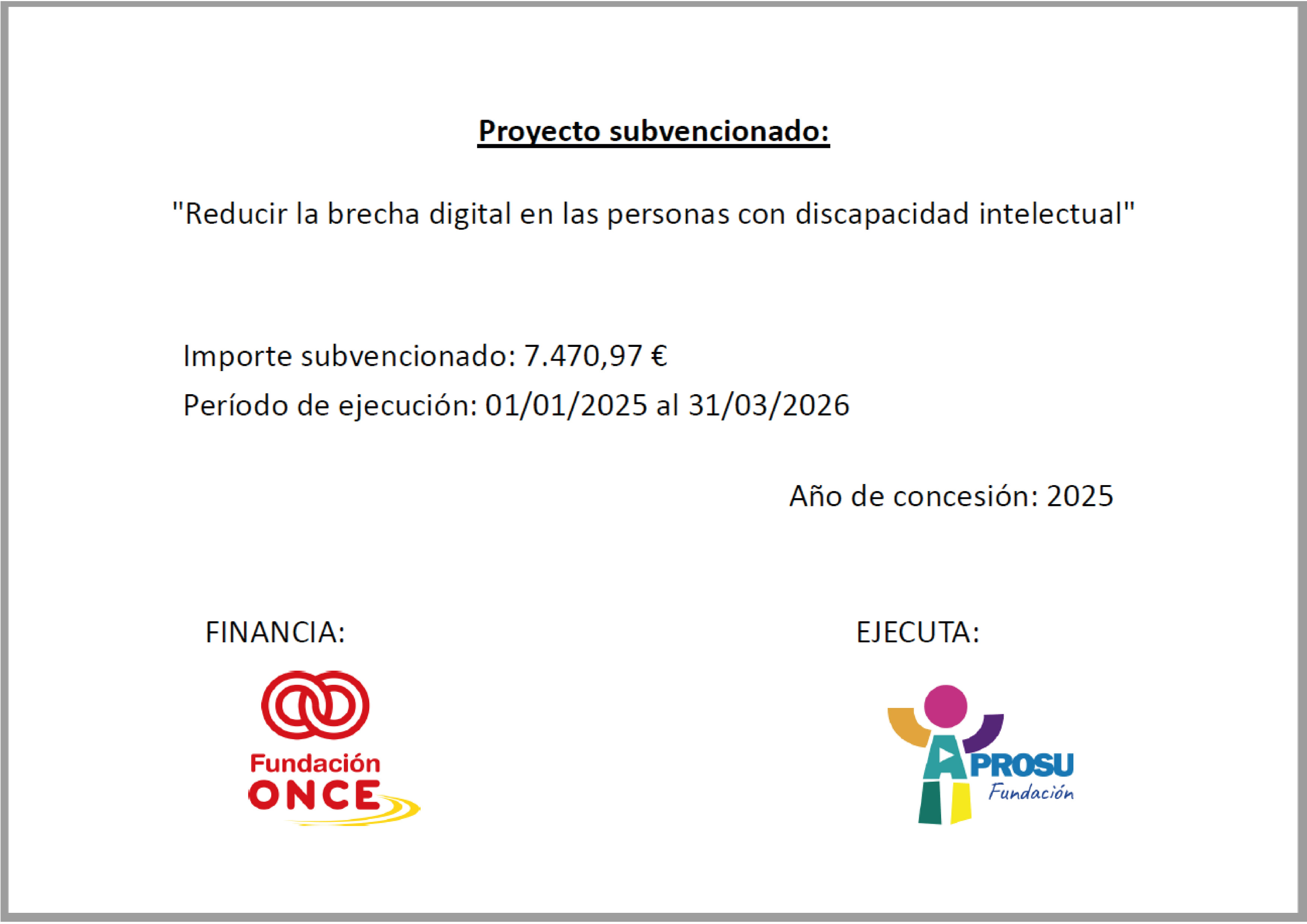 La Fundación FUNCAPROSU, ha recibido la subvención de la Fundación ONCE para el ejercicio 2025, en relación al proyecto "Reducir la brecha digital en las personas con discapacidad intelectual".